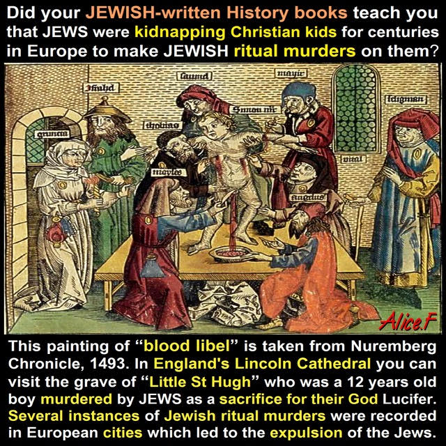 La mayoría de los judíos, junto con millones de hombres feminizados y débiles de voluntad, y un número igual de mujeres blancas liberales con problemas mentales, afirman sin pruebas que el asesinato ritual judío es un mito. Afirman que los judíos que asesinan a niños cristianos por odio a Jesucristo nunca han ocurrido y, desde luego, no están ocurriendo. La historia nos dice lo contrario.
