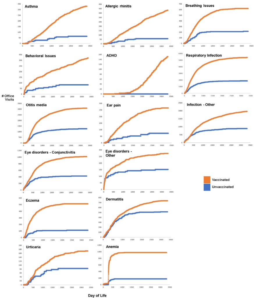 El estudio informó: «El impacto visual de los gráficos de visitas acumuladas al consultorio es sorprendente; más que otros gráficos, el elemento temporal (día de vida) proporciona un índice para comparar la acumulación de dolor y sufrimiento humano por los posibles efectos secundarios de las vacunas ( Figura 5 ) [abajo]. Vale la pena estudiar estos resultados con detenimiento y observar la variación entre las visitas acumuladas al consultorio por afección y las marcadas diferencias entre las tasas de visitas facturadas en la mayoría de los pacientes vacunados y en los no vacunados nacidos en la consulta».