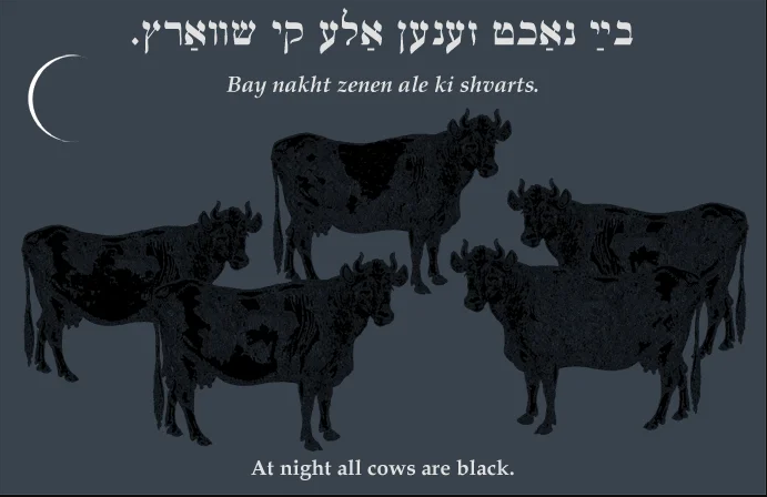 “En una noche en la que todas las vacas son negras” es una frase que se originó como un proverbio yiddish y fue adoptada por el famoso filósofo Georg Wilhelm Friedrich Hegel.